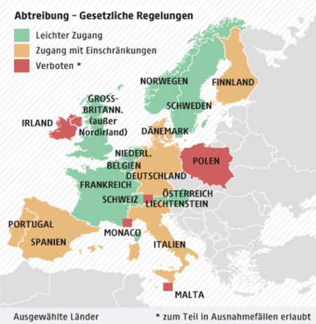 In der Regel – wie auch in Deutschland - wird die Abtreibung nicht über die Krankenversicherung finanziert. Dies ist für Frauen, insbesondere in prekären Verhältnissen, ein großes Problem. In Ländern mit restriktiver Abtreibungspolitik kann die Schwangere gezwungen sein, die Abtreibung im Ausland durchzuführen oder illegal abzutreiben. In Polen wurde das Abtreibungsrecht 1993 stark eingeschränkt und nochmals unter der PiS-Regierung 2021 verschärft. Entsprechend nahmen die legalen Abtreibungen ab. 2021 wurden in Polen noch 300 legale Abtreibungen registriert im Vergleich zu 94 000 legalen Abtreibungen in Deutschland (bei ca. doppelter Einwohnerzahl).